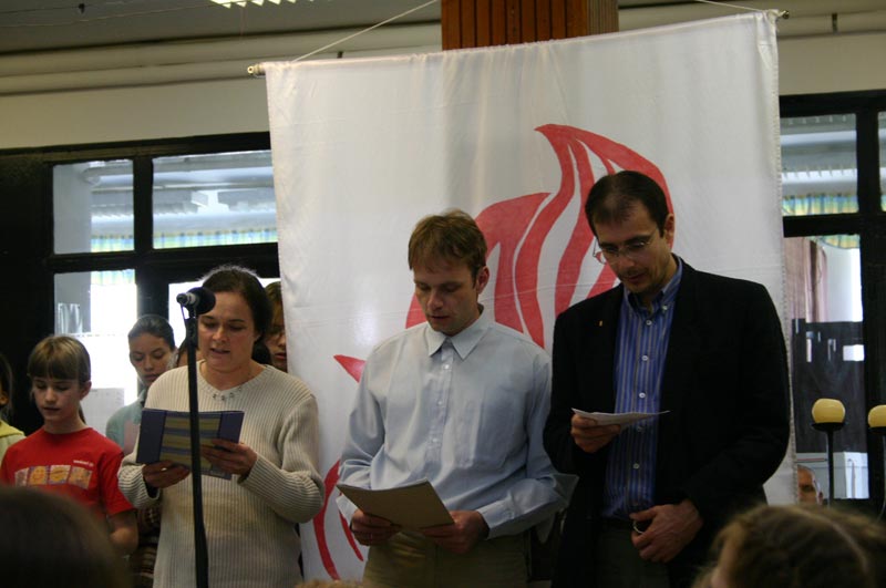 A misét követő szünet rövidnek bizonyult, nehezen foglalták el a jelenlévők ülőhelyeiket, pedig érdekes-nek ígérkezett a székesfehérvári közösségek bemutatkozása, s ők kitűnően meg is feletek várakozá-sunknak. A jól felvezetett, átgondolt és tisztán megfogalmazott mondanivalót, úgy hiszem, mindannyian értettük, akárcsak a történelmi eseményekre utalást. A gyerekek a jövő reményét jelenítették meg, s a záróképben a felnőttekkel együtt állták útját a "nagybaltás embernek", aki a bokor kivágásának szándé-kával jelent meg az előadás első képében. |